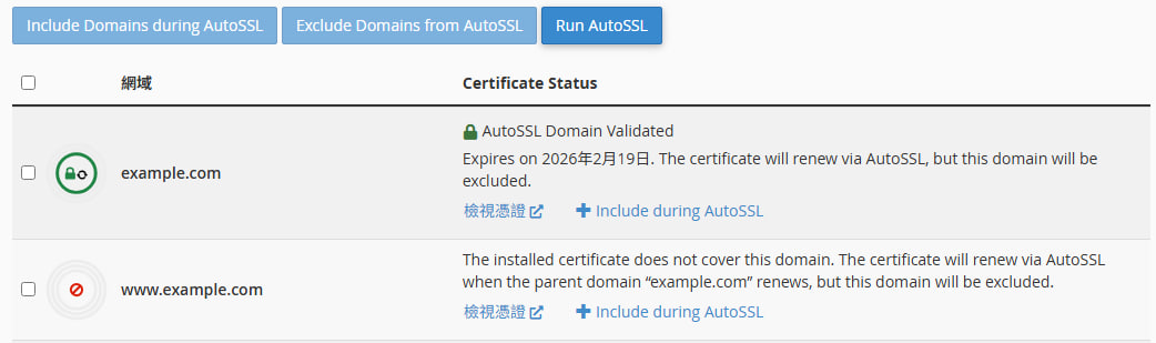 若某些網域顯示「尚未安裝」或「無效」,則代表 SSL 尚未啟用,你需要執行 AutoSSL 來完成安裝(下一步會教你怎麼做)。