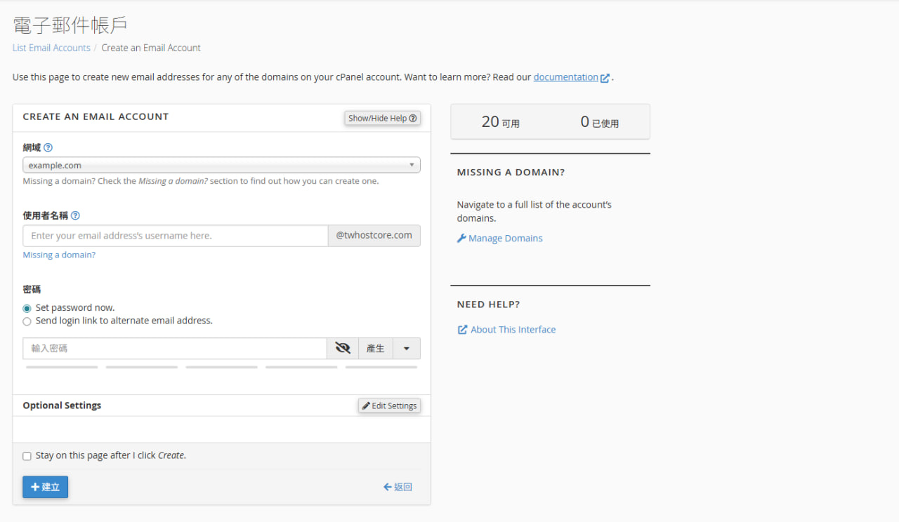 登入 cPanel,找到「Email Accounts」,選擇你的網域後建立一組新信箱,例如: