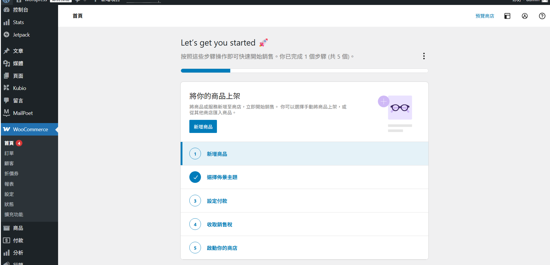 三、WooCommerce 安裝後會進入「快速設定精靈」