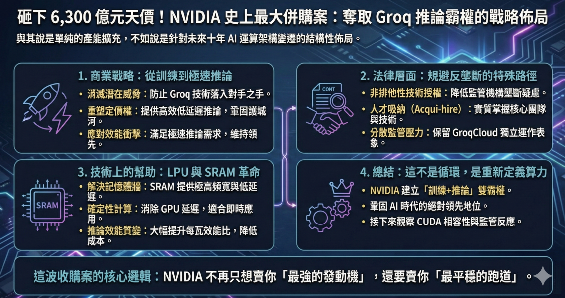 - 非排他性技術授權(Licensing Agreement): 法律上 NVIDIA 並非「買下」整間公司,而是買下技術授權。這能降低監管機構對「壟斷」的指控,因為 Groq 名義上仍維持獨立經營。