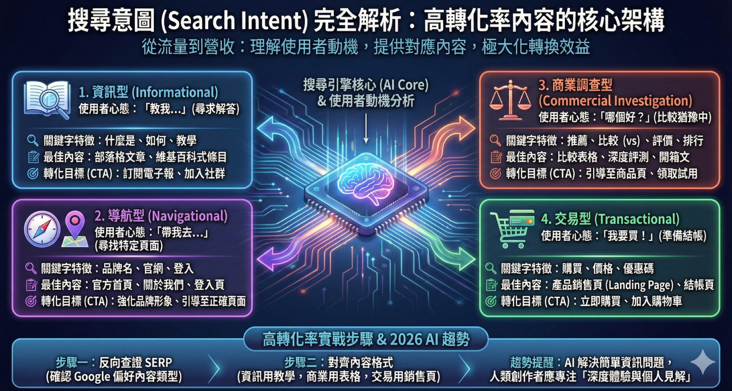 資訊型重結構與清楚解答,商業調查型必須包含比較表格,交易型則應簡化流程並放大信任元素。